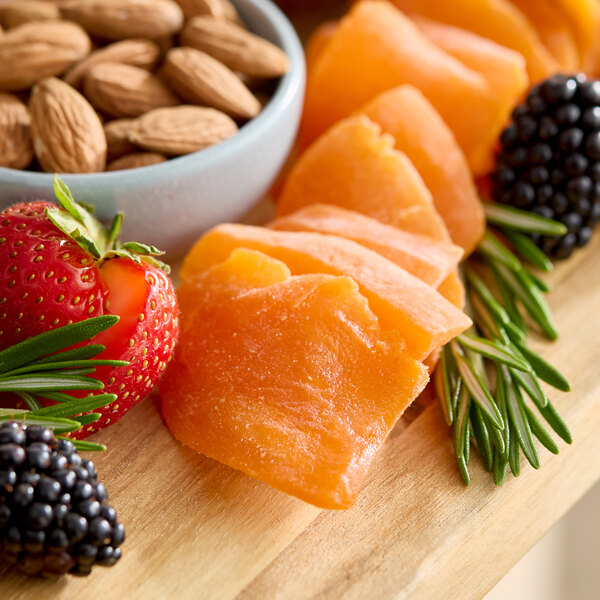There are countless ways to use these dried mango slices in your commercial kitchen. Try chopping them up and adding them to snack mixes, granola bars, or muffins. They also make a great snack on their own! Use them to create a sweet and spicy mango habanero salsa or incorporate them into a refreshing salad alongside grilled chicken, mixed greens, diced tomatoes, red onions, and avocado. To rehydrate these mango slices, simply soak them in warm water and blend them into your favorite pie filling, dressing, or smoothie. Their natural sweetness makes them a great choice for adding a pop of flavor to a wide range of sweet treats and savory dishes, and they're sure to be a hit with health-conscious customers!
