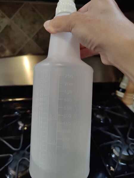 Handy spray bottle with multiple options: stream, mist, and lock. No plastic smell to the chamber! I use this to most dough for making a nice bread crust. I like that the fluid measurements are imprinted into the side of the bottle. However, the "water" label is not imprinted and is a coating that comes off easily. When I received this item, the warehouse sticker was stuck into front and part of the "W" peeled off right away.