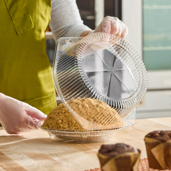 Streamline your bakery packaging process with this Inline Plastic SureLock 8" clear plastic hinged pie container with high dome lid! Made from recycled PET plastic, this container is recyclable and made with 10% post-consumer recycled content, making it an eco-friendly choice for your business. This container is designed to hold an 8" pie, and its clear construction offers optimal product visibility so you can easily create attractive displays of your baked goods. Whether you run a bakery, grocery store, cafe, or catering business, this versatile container is perfect for showcasing your delicious pies.