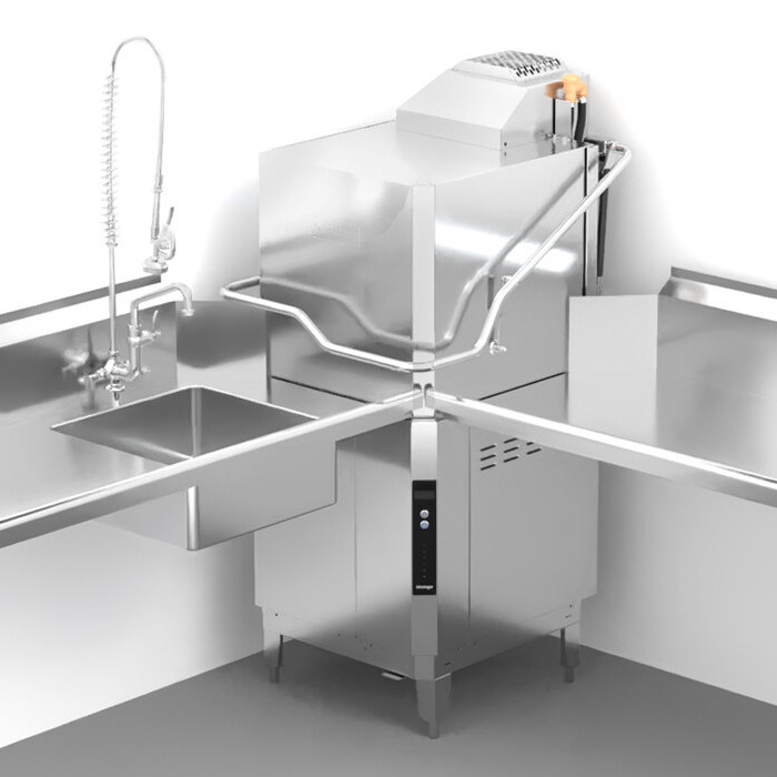 Designed to be safe and sanitary for foodservice environments, it's the ideal solution for dish rooms without proper ventilation or where installing a traditional exhaust system isn't possible. This unit provides convenient use with a front-mounted wash tank, an easy-glide door with an Ergo-Grip door handle that ensures smooth corner installations without modification, and a foot-operated drain pedal. It features a drain flow peak rate of 35 gallons per minute and an overflow designed for energy conservation with low-water protection. It has a StatusGlow LED indicator bar, a swing-out corner control panel with a waterproof IP67 control board for protection from moisture, and anti-vandal stainless steel buttons.