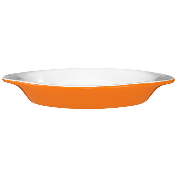 Bring a festive flair to your meal service with this International Tableware WRO-8-EW-O Cancun 8 oz. orange and white two-tone stoneware rarebit! This stoneware rarebit is designed to elegantly serve baked appetizers or sides with two side handles that make it easy to carry from oven to table. It's fully vitrified for superior durability and lasting performance, and it's oven safe up to 350 degrees Fahrenheit for superior versatility. Use it to serve piping hot, creamy casseroles, dips, and scalloped potatoes right from the oven! This rarebit features a beautiful orange color on the outside for a fresh, contemporary look, paired with a bright European white color on the inside. It's great for trendy restaurants, diners, coffee shops, and cafes. Mix and match with other colors in the Cancun collection to spice up your tabletop presentation!