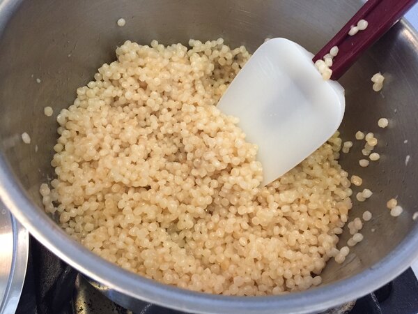 This bag of Israeli toasted pearl couscous makes it easy to whip up a side dish in an instant. To prepare it, start by sauteing the couscous in oil. Then add 1 1/4 cups of boiling water and mix the couscous in a pan. Cover and simmer for 8-10 minutes and stir occasionally. Once the water is absorbed, fluff it with a fork and this couscous is ready to serve.