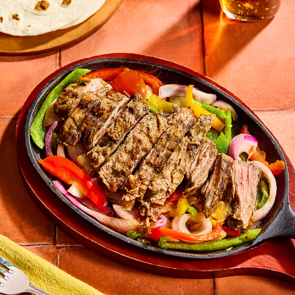This steak combines exquisitely savory flavor with fast and easy prep, helping you serve great-tasting food faster. This skirt steak can be heated on your stove top, in the oven, or on the grill for extra savory, meaty flavor. No matter how you prepare them, these steaks should be cooked to an internal temperature of 165 degrees Fahrenheit. Once they're cooked, allow the steaks to rest for 3 minutes before slicing them against the grain and serving them sizzling hot with peppers and onions!