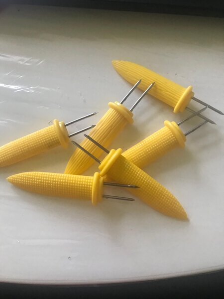 The durable polypropylene exterior and stainless steel prongs of these corn holders are built to last, and remain firmly in place while attached to an ear of corn.