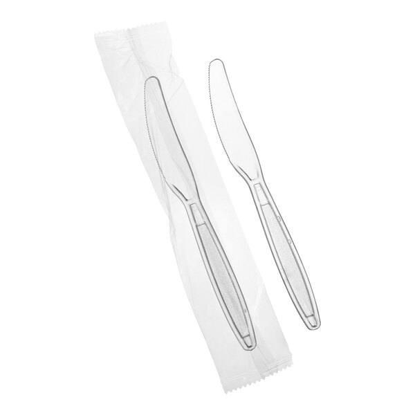 This Choice clear heavy weight wrapped polystyrene plastic knife is perfect for your take-out restaurant, cookout, party, gathering, or other catering event.