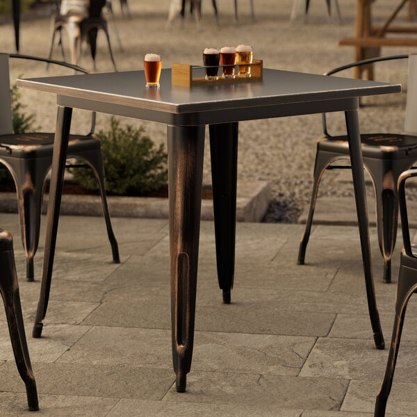 This table is made of durable steel and coated to withstand years of use. The distressed copper color adds a sleek, modern touch to any setting and is sure to be a contemporary design choice that guests love. Comfortable and stylish, this strong yet light weight standard-height table is an excellent choice for your indoor or outdoor dining area. To save you money on shipping costs, this table ships unassembled. All required assembly hardware is included so you can quickly set it up in its proper space and let your guests enjoy!