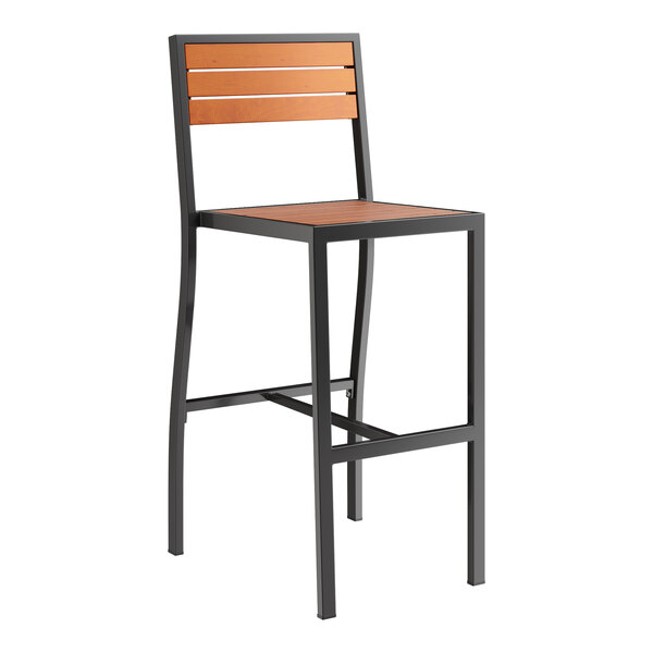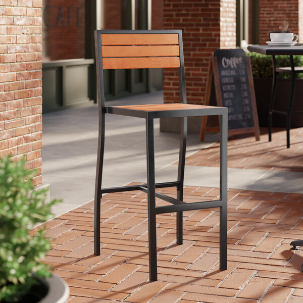 Lancaster Table & Seating Axel Black Powder-Coated Outdoor Barstool with Brown Faux Teak Slat Seat