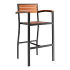 Lancaster Table & Seating Axel Black Powder-Coated Outdoor Barstool with Gray Faux Teak Slat Seat and Arms