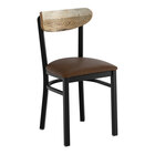 Seat your guests in comfort and style with this Lancaster Table & Seating Boomerang black finish chair with 2 1/2" dark gray vinyl padded seat and driftwood back. This chair's wooden Boomerang back and padded seat combine with its modern steel frame to instill a unique look in any location. Plus, since this chair's back is contoured for a customer's back, it will provide comfort while maintaining a distinct appearance.