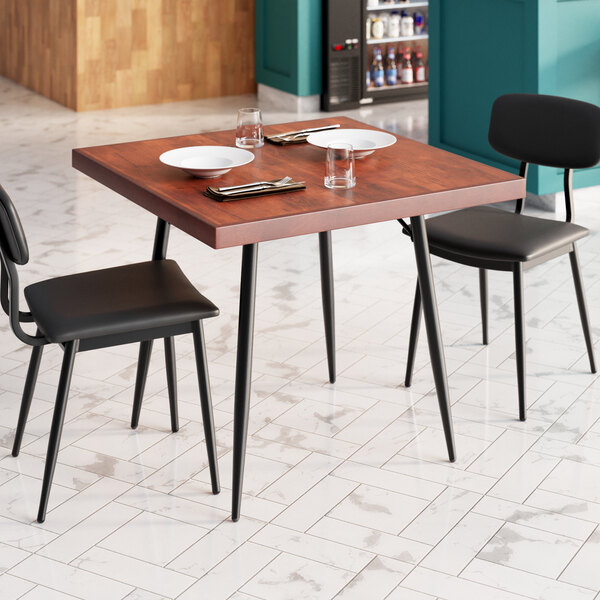 Add a unique and modern twist to your restaurant with this Lancaster Table & Seating mid-century 36" x 36" standard height butcher block table with mahogany finish.