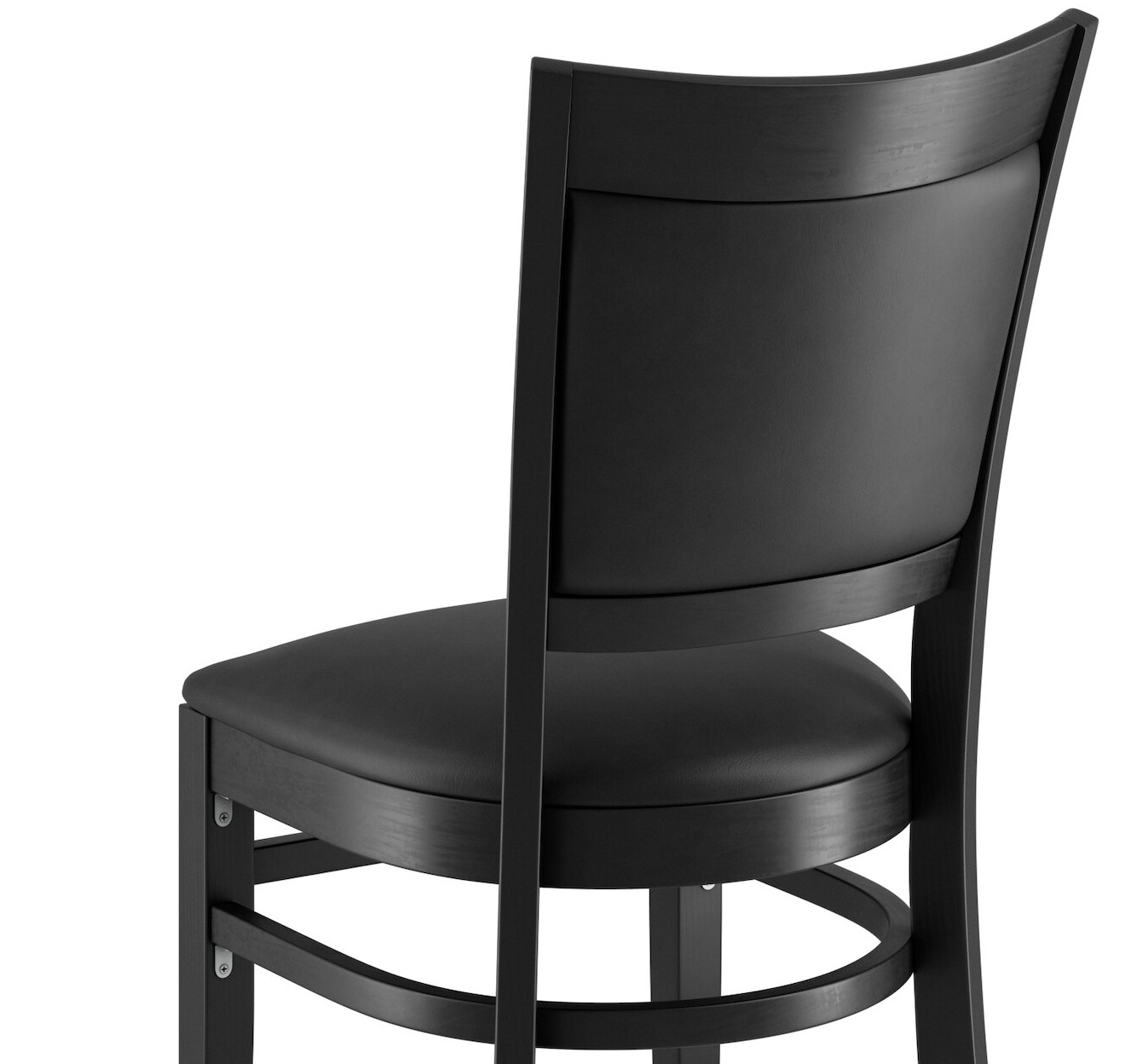 To ensure your patrons are comfortable while they enjoy your signature drinks or meals, this chair also features a supportive upholstered back. The 2 1/2" thick black vinyl padded seat provides an added layer of comfort for your guests, and it's also durable and easy to clean! It is made with fire-retardant foam for added safety.