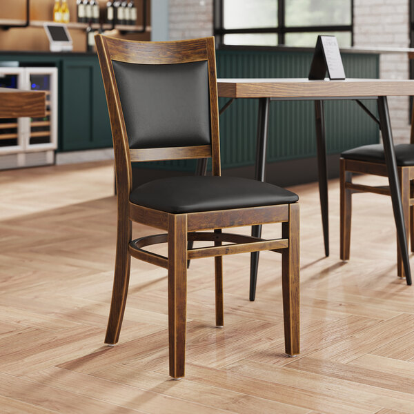 This chair's sleek padded back and seat combines with its attractive wooden frame to instill a unique look in any location. At an ideal height for standard dining table height seating, this chair is a versatile option for any restaurant, bar, deli, or coffee shop. Plus, each leg comes with an integrated glide to protect your floors from scuffing.