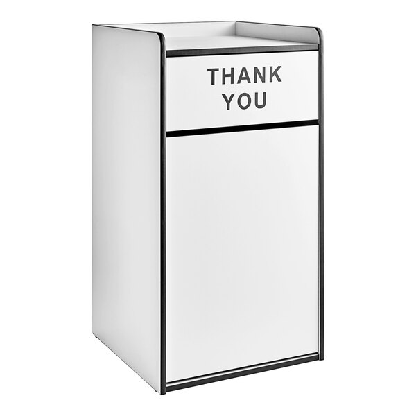 This model includes a swing top door for easy disposal of trash, and a black "THANK YOU" message to let guests know you appreciate their business.