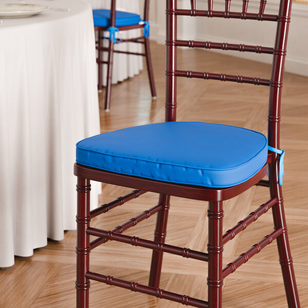 This cushion features a 2" thick polyurethane sponge interior to ensure that all guests are seated comfortably at any event. The attractive blue color enhances your event's decor, complementing the chair's upscale appearance. Give your event space an eye-catching, yet comfortable upgrade with this cushion.