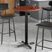 This table is made with resin and wood particle fused together. It sports a 22" x 22" cast iron base plate while the column is made from painted steel. A resilient cast iron spider secures the column to the tabletop for wobble-free stability. The tabletop sports a red mahogany finish that complements any setting while the rounded edges provide added safety for children.