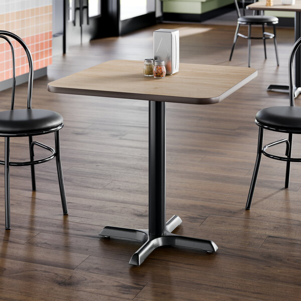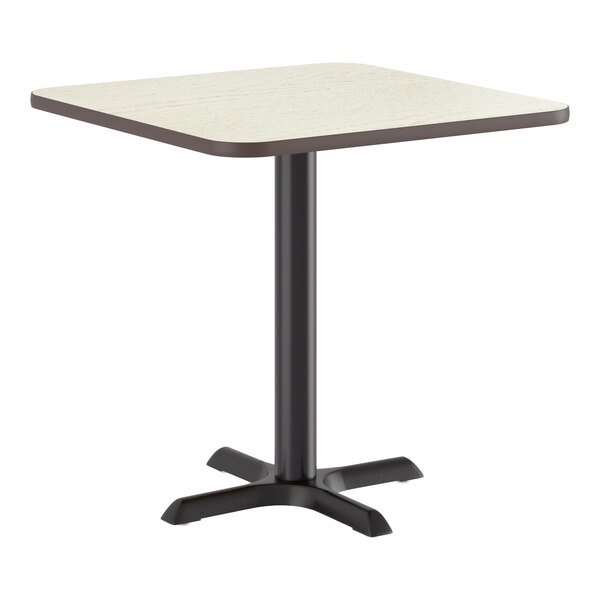 Take the guess-work out of selecting compatible table tops and bases with this 30" x 30" reversible white birch / ash table top and cross base plate! This table gives your establishment a modern look and provides your guests a stable place to comfortably enjoy their drinks and food! From the strong, sturdy cast iron base plate and spider, to the sleek black column and durable laminated table top, this table is an all-in-one addition to any establishment. Plus, with a contemporary square shape, it's sure to add aesthetic appeal to any establishment. The compact 30" x 30" design comfortably seats 2 to 4 guests without taking up too much room, making it the perfect choice for any restaurant, pizza shop, or cafeteria!