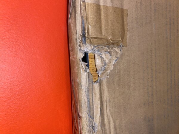 Recieved my order from FedEx, box was torn / dented in several places. Upon inspection discovered what appeared to be a manufacturing defect. Edge of table had a chipped place, this must have happened at factory because it had been puttied to touch it up. And it also had been dropped on one of the corners, edging was marred and laminate was chipped. They did send a replacement! When I received the 2nd top, it had the same Mfg. defect I discribed. And a corner was damage on it also