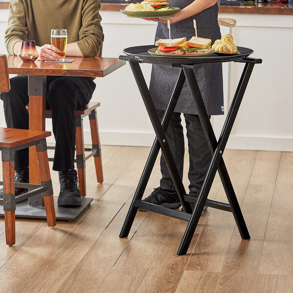 This tray stand is an attractive alternative to metal tray stands, with an all-wood construction and sleek black finish that will blend seamlessly into a variety of decors. Great for busy restaurants with high-traffic areas, this stand makes the ideal addition to your dining room service by holding large trays of food to free your servers' hands.
