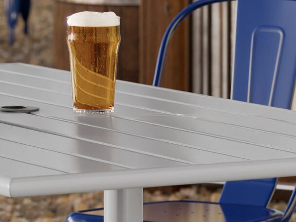 A built-in umbrella hole allows the table to be paired with a compatible umbrella (sold separately) to add shade at your restaurant or cafe.