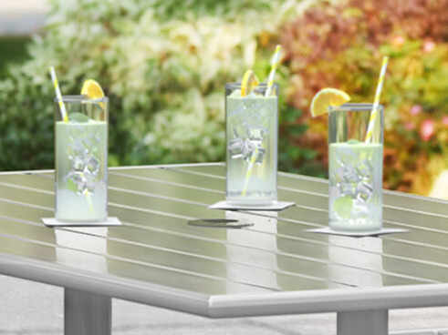 This table is made of powder-coated aluminum, which is tough enough to resist weather and corrosion. Place it on your patio and let your guests enjoy!