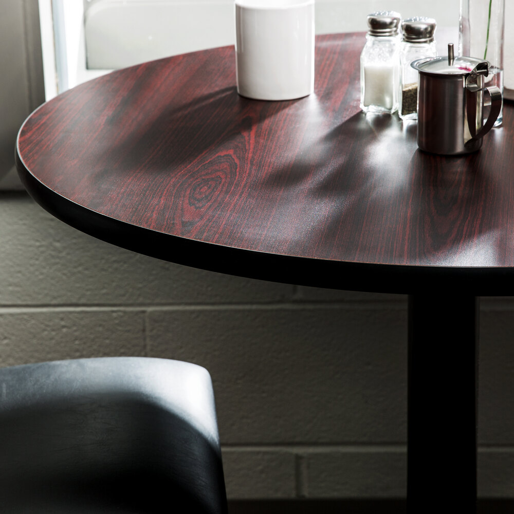 Lancaster Table & Seating's laminate round reversible table top is durable, high quality, and perfect for any restaurant. One side of this table has a black finish and the other a cherry look finish to maximize versatility and allow you to match your business' decor. This table top measures 36" in diameter and is 1 1/8" thick. Plus, it has black vinyl molding on its edges to protect against scuffing and chipping. This table top can also be used in bars, pizzerias, bistros, buffets, or banquets.