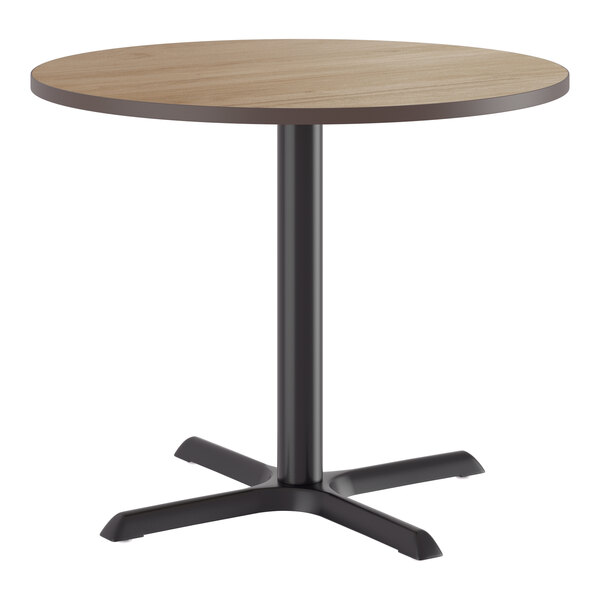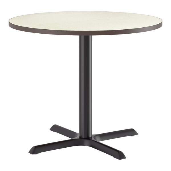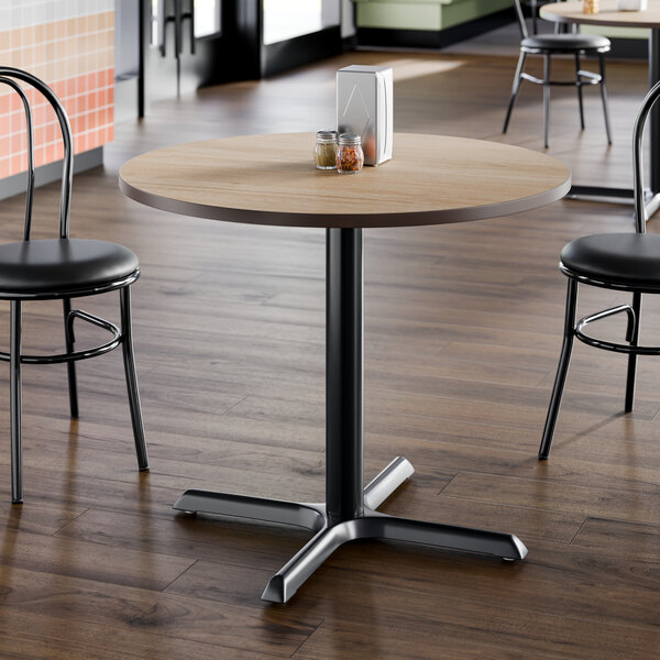 Take the guess-work out of selecting compatible table tops and bases with this 36" round reversible birch / ash table top and cross base plate! This table gives your establishment a modern look and provides your guests a stable place to comfortably enjoy their drinks and food! From the strong, sturdy cast iron base plate and spider, to the sleek black column and durable laminated table top, this table is an all-in-one addition to any establishment. Plus, with a contemporary round shape, it's sure to add aesthetic appeal to any establishment, setting itself apart from traditional square or rectangular table layouts. The compact 36" design comfortably seats 3 to 4 guests without taking up too much room, making it the perfect choice for any restaurant, pizza shop, or cafeteria!