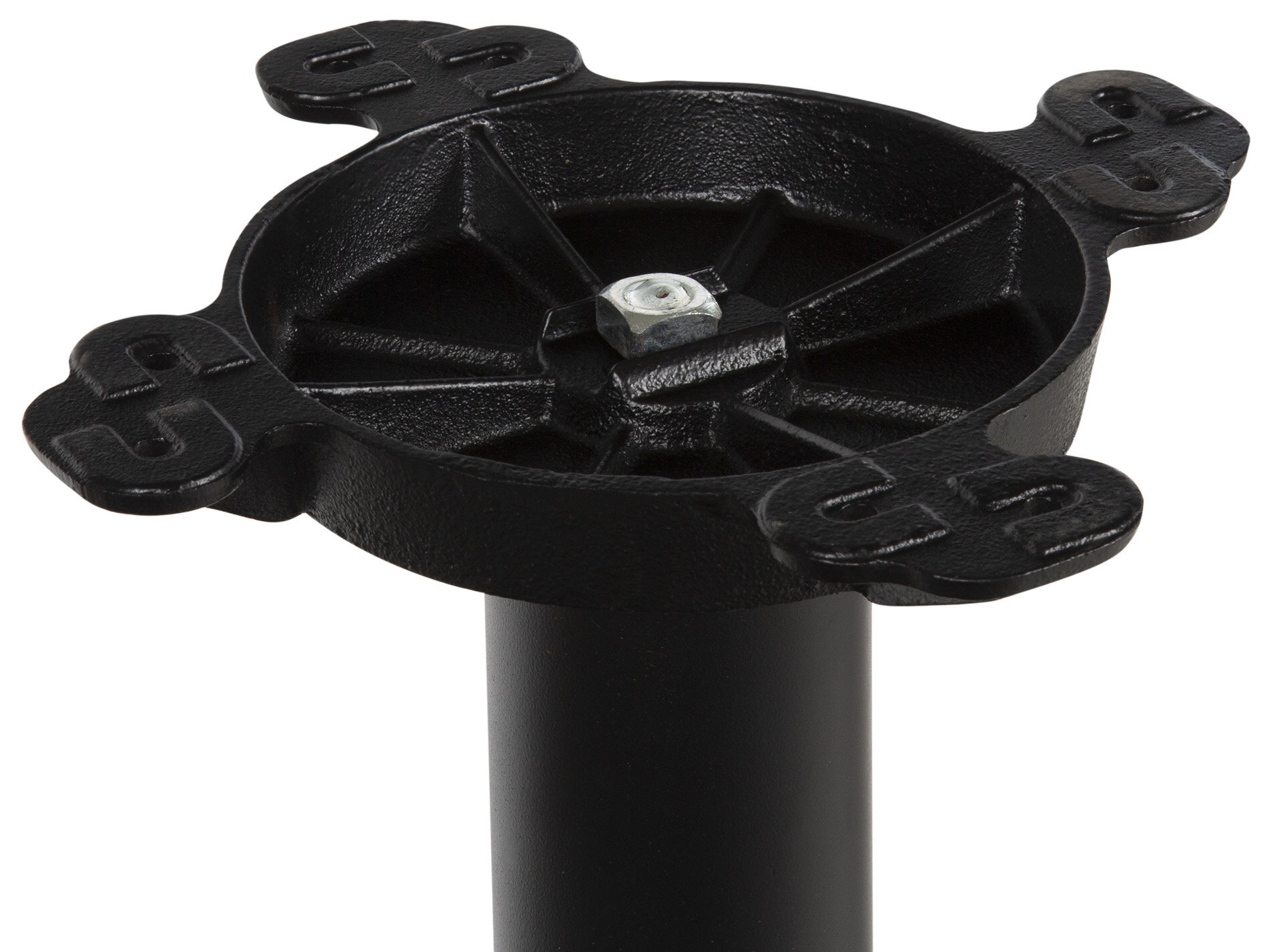 The post measures at 3" in diameter with a threaded interior rod that easily affixes to the spider plate. The spider is made of a heavy cast iron with 8 pre-drilled holes for the included pan head screws to secure the column to the tabletop.