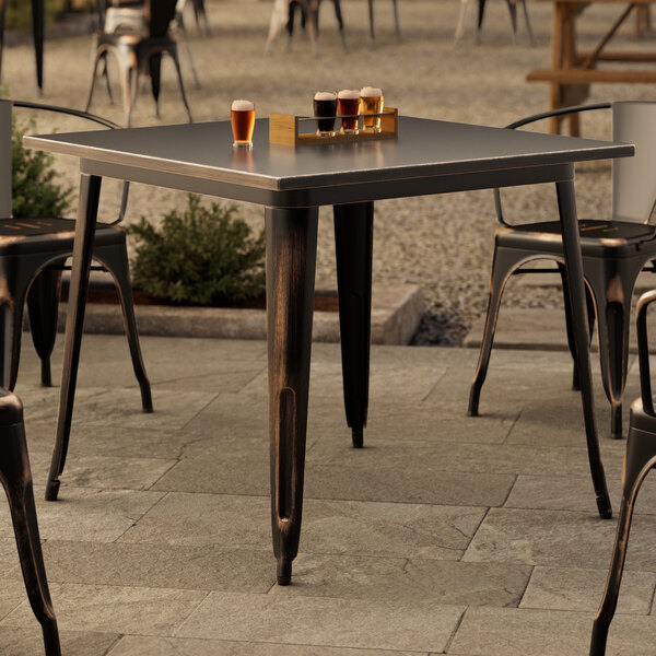 This table is made of durable steel and coated to withstand years of use. The distressed copper color adds a sleek, modern touch to any setting and is sure to be a contemporary design choice that guests love. Comfortable and stylish, this strong yet light weight standard-height table is an excellent choice for your indoor or outdoor dining area. To save you money on shipping costs, this table ships unassembled. All required assembly hardware is included so you can quickly set it up in its proper space and let your guests enjoy!