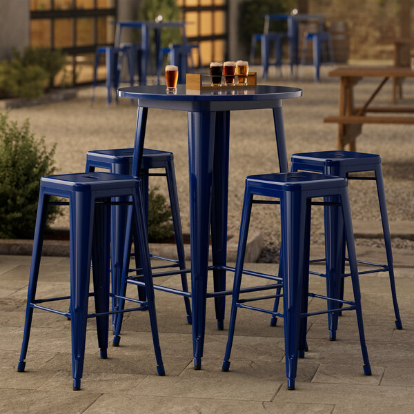This set is made of durable steel and coated to withstand years of use. The sapphire color adds a sleek, modern touch to any setting and is sure to be a contemporary design choice that guests love. Comfortable and stylish, this strong yet lightweight set is an excellent choice for your indoor or outdoor dining area. To save you money on shipping costs, the table ships unassembled. All required assembly hardware is included so you can quickly set it up in its proper space and let your guests enjoy! The barstools ship fully assembled.