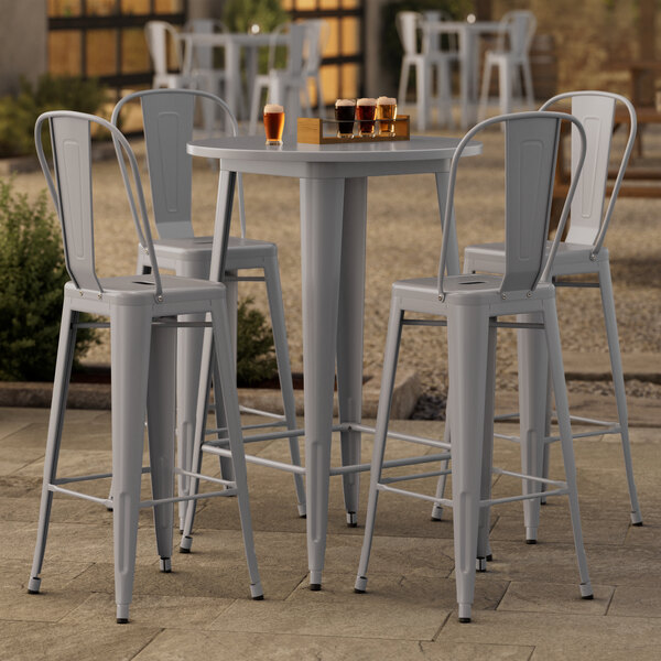 This set is made of durable steel and coated to withstand years of use. The gray color adds a sleek, modern touch to any setting and is sure to be a contemporary design choice that guests love. Comfortable and stylish, this strong yet lightweight set is an excellent choice for your indoor or outdoor dining area. To save you money on shipping costs, the table ships unassembled and the stools ship with the backrests detached. All required assembly hardware is included so you can quickly set it up in its proper space and let your guests enjoy!