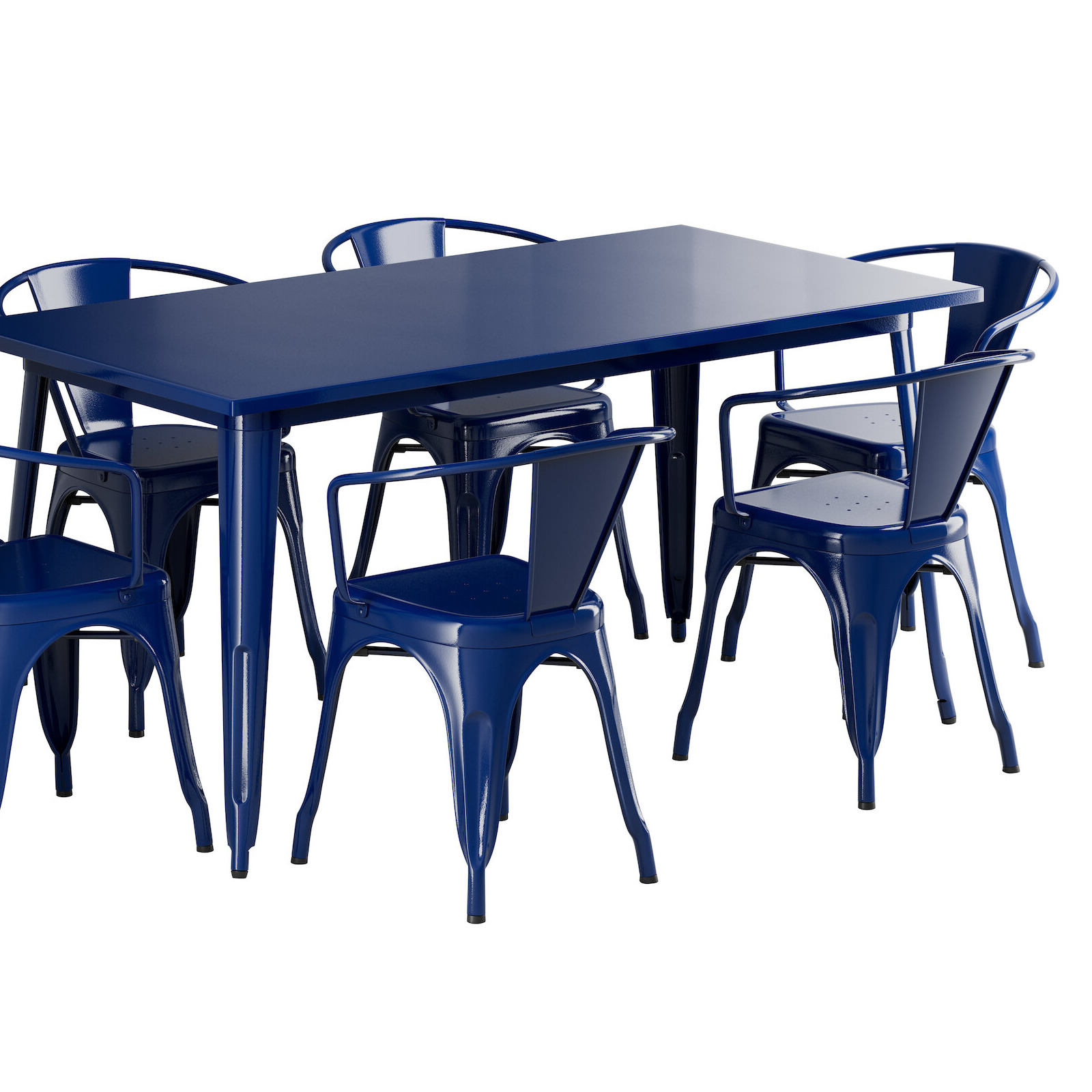 This set is made of durable steel and coated to withstand years of use. The sapphire color adds a sleek, modern touch to any setting and is sure to be a contemporary design choice that guests love. Comfortable and stylish, this strong yet lightweight set is an excellent choice for your indoor or outdoor dining area. To save you money on shipping costs, the table ships unassembled. All required assembly hardware is included so you can quickly set it up in its proper space and let your guests enjoy! The chairs ship fully assembled.