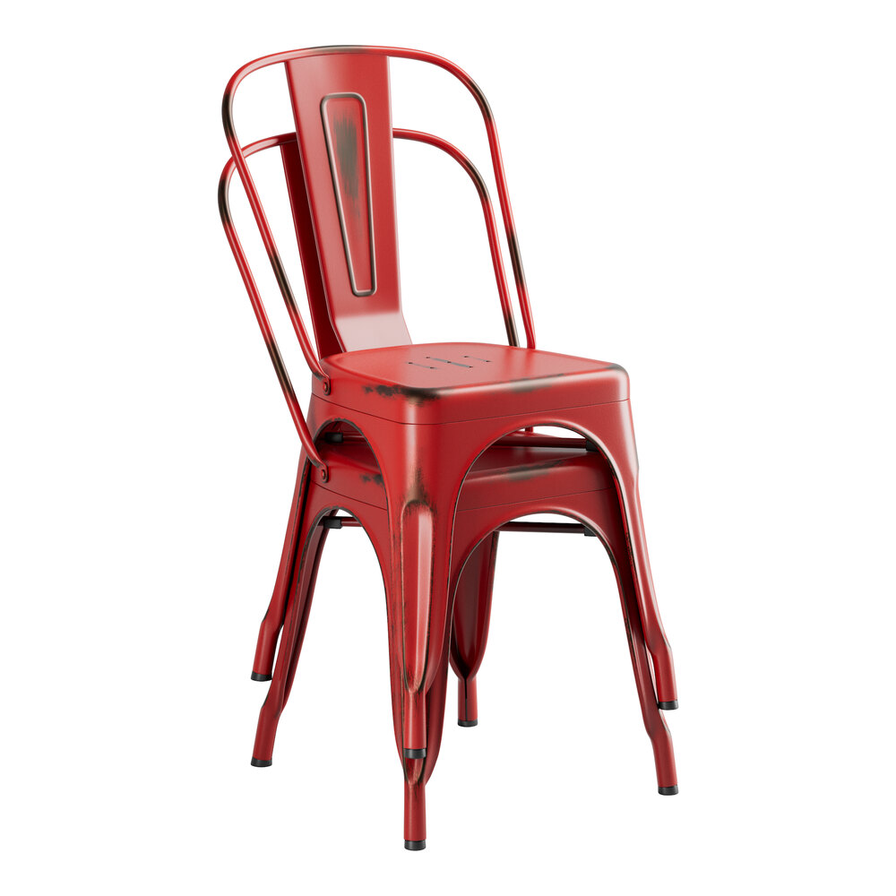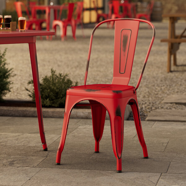 This chair is made of durable steel and coated to withstand years of use. The distressed ruby-red color adds a sleek, modern touch to any setting and is sure to be a contemporary design choice that guests love. Comfortable and stylish, this strong yet lightweight chair is an excellent choice for your indoor or outdoor dining area. To save time and hassle, this chair ships fully assembled.