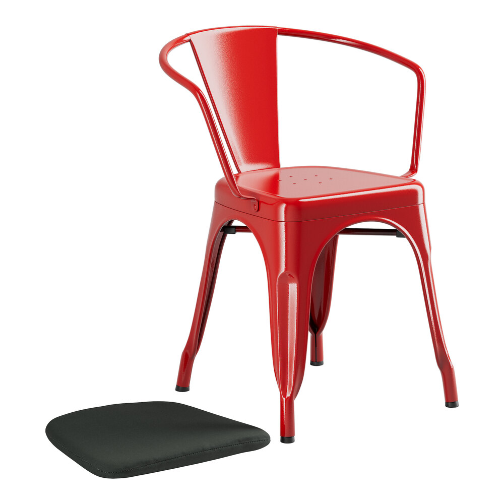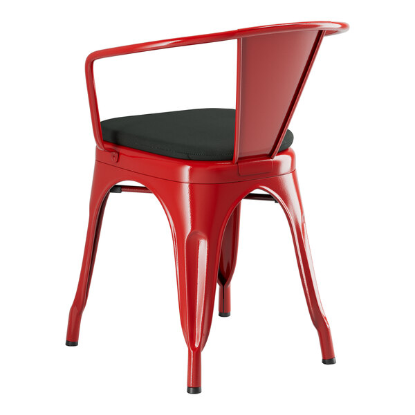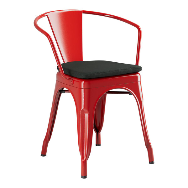 Take your modern restaurant, cafe, or bistro to the next level with this Lancaster Table & Seating Alloy ruby-red outdoor arm chair with black fabric magnetic cushion!