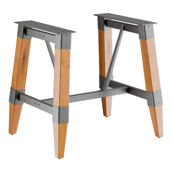 This table base combines the natural look of wood with rugged metal accents to add a rustic element with contemporary flair to your establishment. The perfect piece for your winery, brewery, or farm-to-table eatery, this table base elevates compatible table tops to a comfortable height, ensuring tables stay steady and balanced while guests enjoy your signature drinks and dishes.