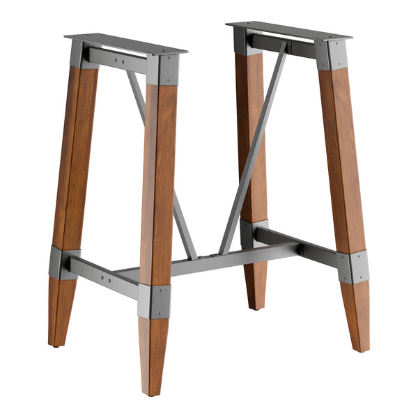 This table base combines the natural look of wood with rugged metal accents to add a rustic element with contemporary flair to your establishment. The perfect piece for your winery, brewery, or farm-to-table eatery, this table base elevates compatible table tops to a comfortable height, ensuring tables stay steady and balanced while guests enjoy your signature drinks and dishes.