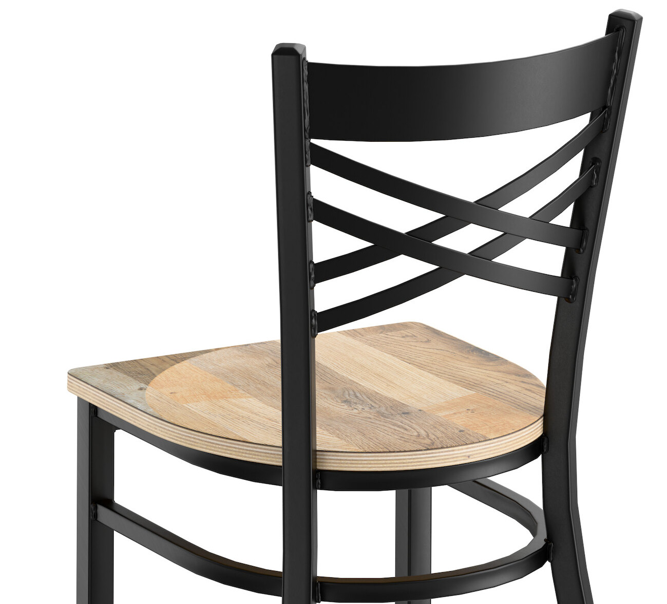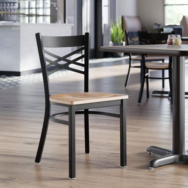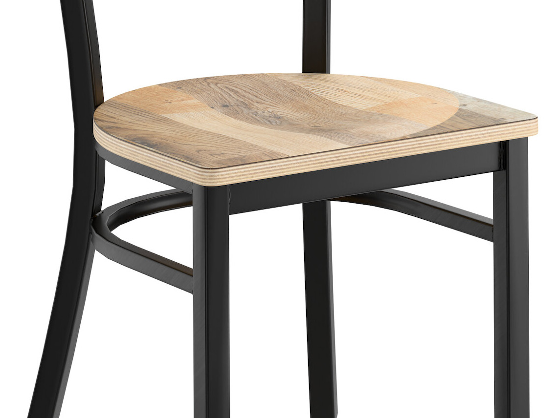 This chair's sleek wood seat combines with its contemporary cross back steel frame to instill a modern look in any location. Plus, since this chair's back is contoured for a customer's back, it will provide comfort while maintaining a distinct appearance.