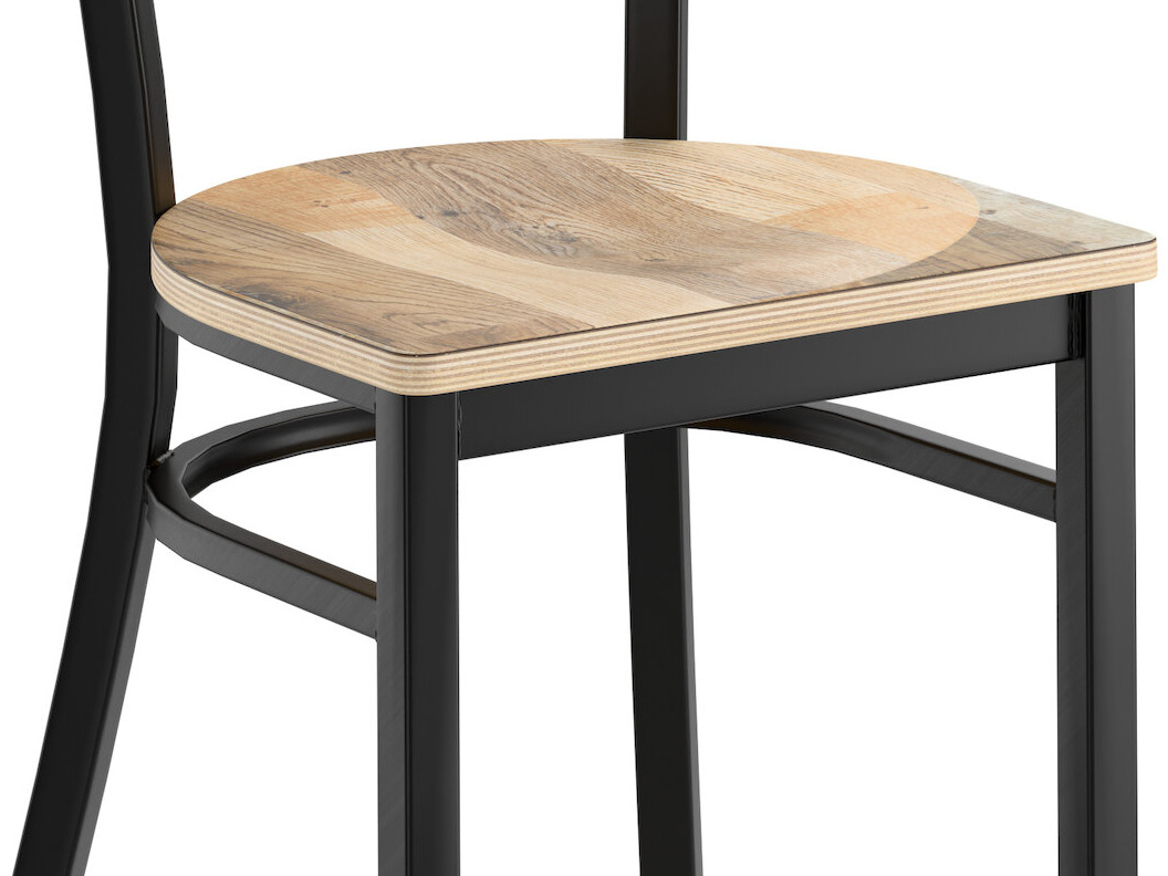 Very sturdy chair - I like the wooden seat with the black metal frame. Matches nice with our Oak table for home use.