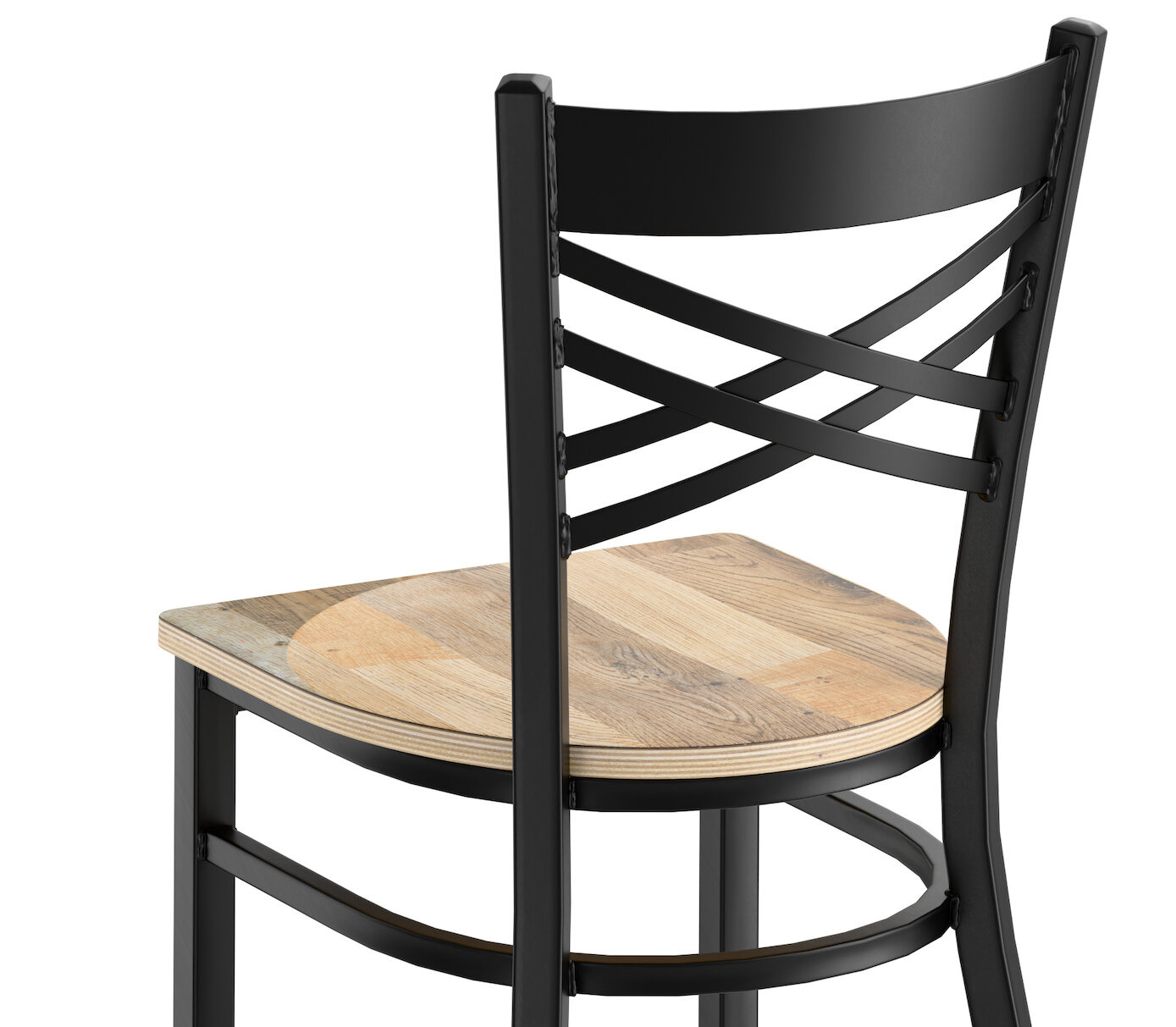This chair's sleek wood seat combines with its contemporary cross back steel frame to instill a modern look in any location. Plus, since this chair's back is contoured for a customer's back, it will provide comfort while maintaining a distinct appearance.