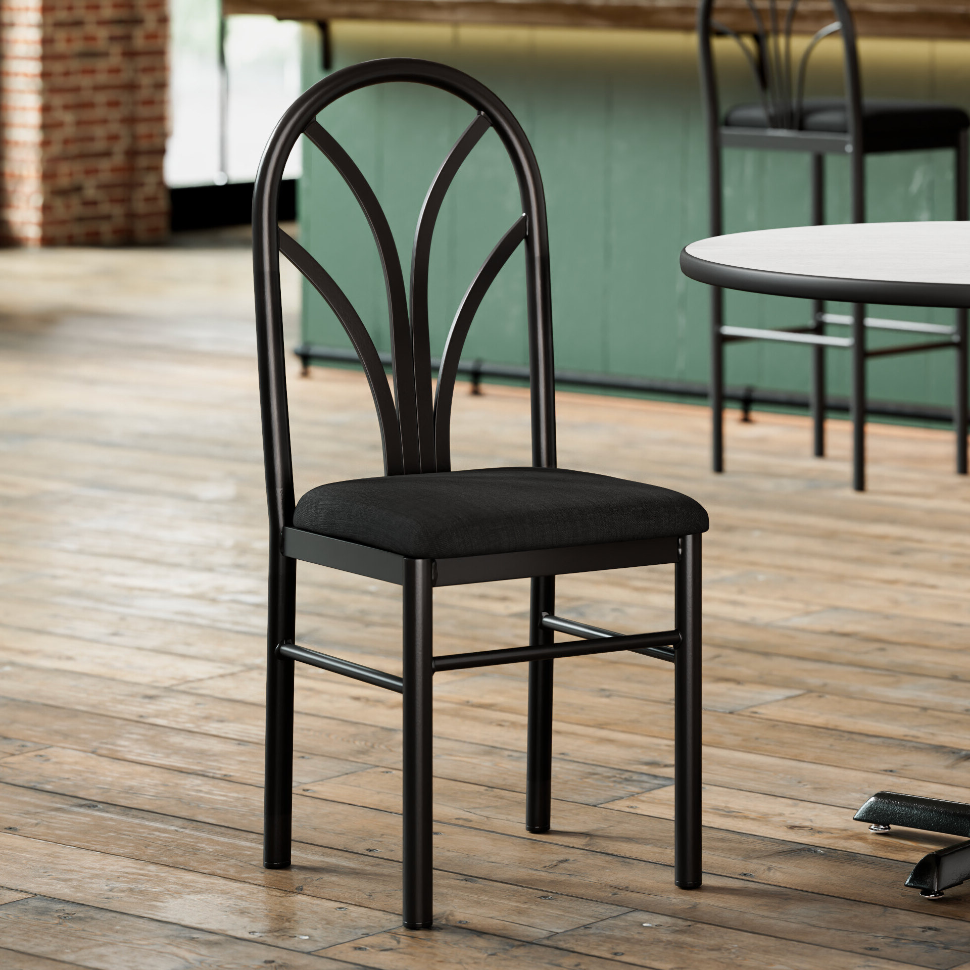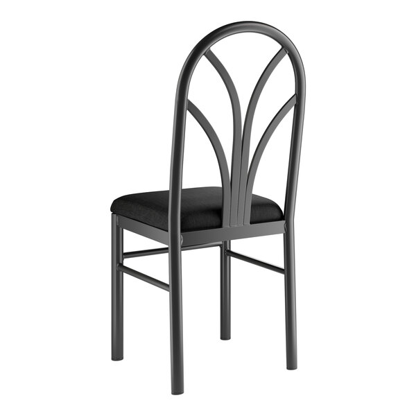 This chair features a spoke back design with slim, curved lines that start from a central point and radiate out, creating a unique fan shape that's both simple and stylish. The 1 3/4" thick black fabric padded seat provides exceptional comfort for your guests, and it's also durable and easy to clean! It is made with fire-retardant foam for added safety.