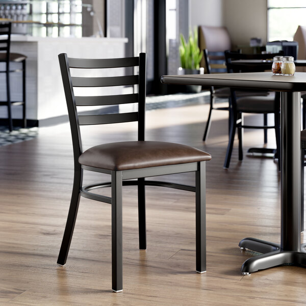 Seat your guests in comfort and style with this Lancaster Table & Seating black finish ladder back chair with 2 1/2" dark brown vinyl padded seat.