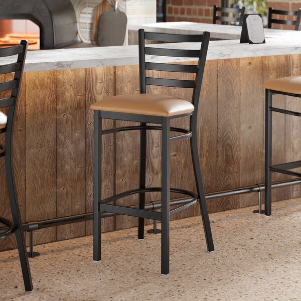 Seat your guests in comfort and style with this Lancaster Table & Seating black finish ladder back bar stool with 2 1/2" light brown vinyl padded seat.
