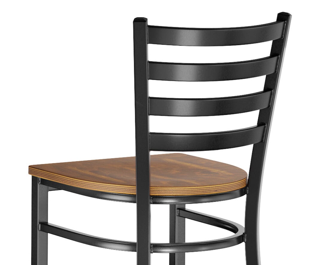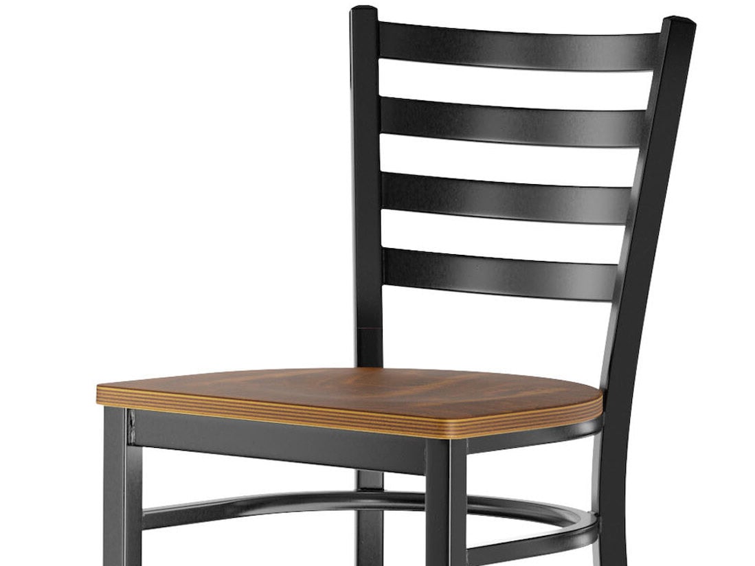 This bar stool's sturdy wood seat with a sleek vintage finish combines with its contemporary ladder back steel frame to instill a modern look in any location. Plus, since this bar stool's back is contoured for a customer's back, it will provide comfort while maintaining a distinct appearance.