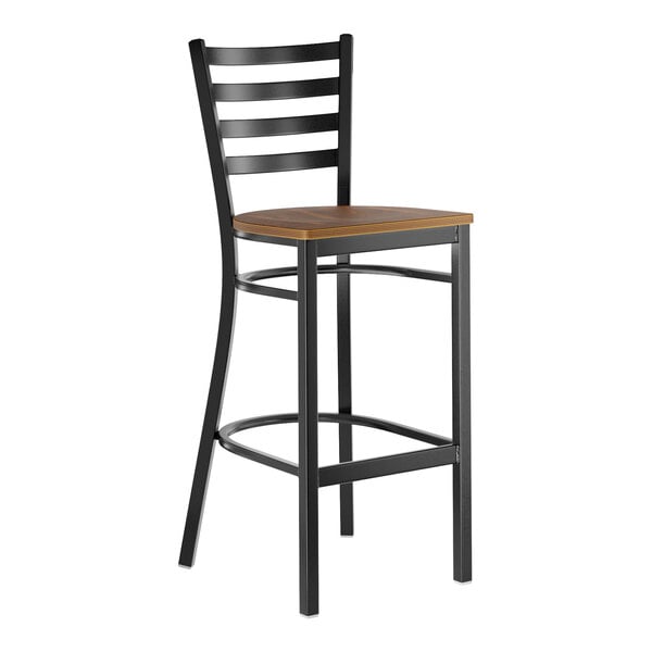 Seat your guests in comfort and style with this Lancaster Table & Seating black finish ladder back bar stool with vintage wood seat.