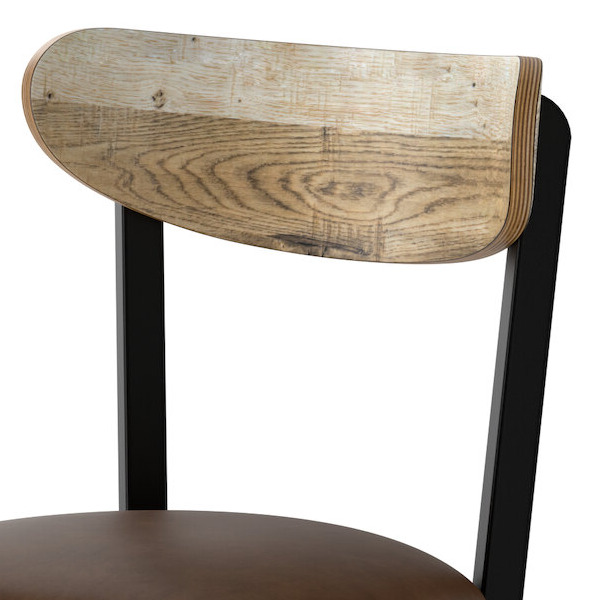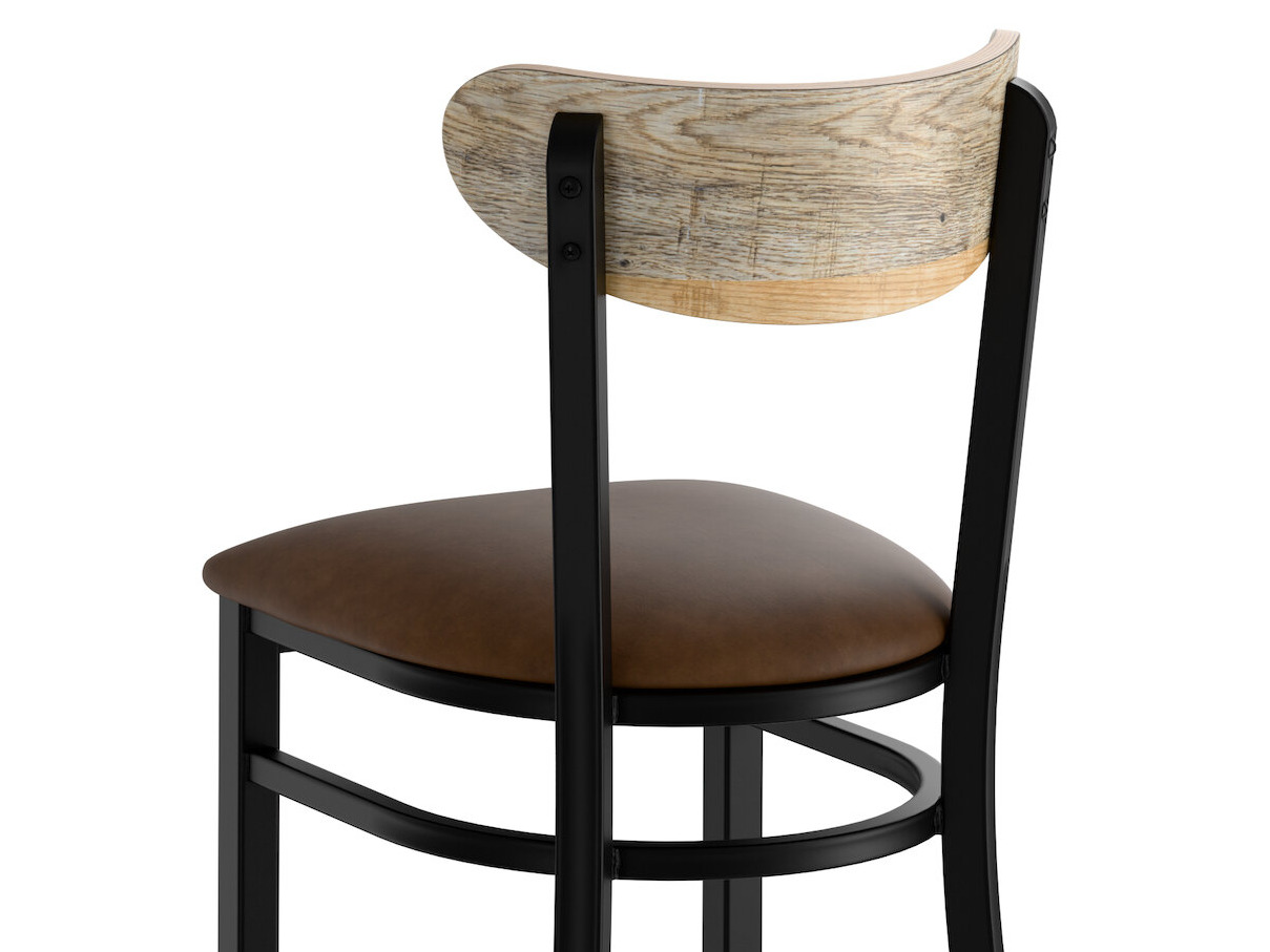 This bar stool's wooden Boomerang back and padded seat combine with its modern steel frame to instill a unique look in any location. Plus, since this bar stool's back is contoured for a customer's back, it will provide comfort while maintaining a distinct appearance.
