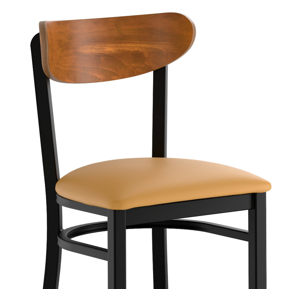 This bar stool's wooden Boomerang back and padded seat combine with its modern steel frame to instill a unique look in any location. Plus, since this bar stool's back is contoured for a customer's back, it will provide comfort while maintaining a distinct appearance.
