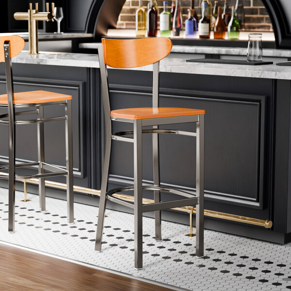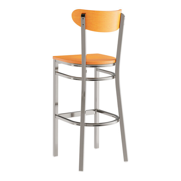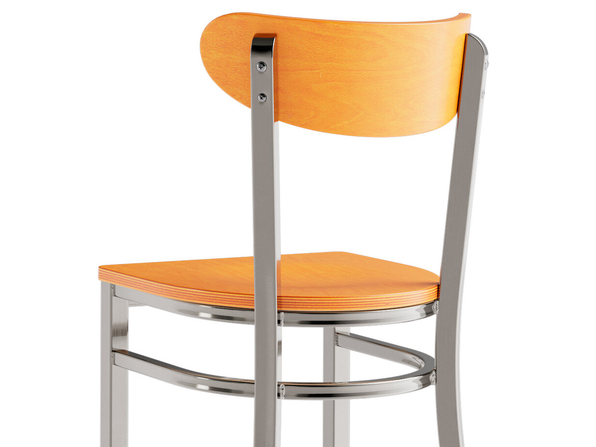 This bar stool's wooden Boomerang back and seat combines with its modern steel frame to instill a unique look in any location. Plus, since this bar stool's back is contoured for a customer's back, it will provide comfort while maintaining a distinct appearance.