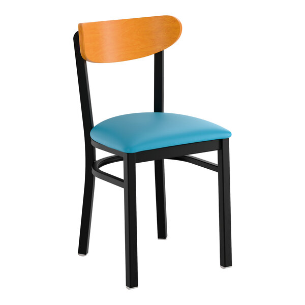 Lancaster Table & Seating Boomerang Black Finish Chair with Blue Vinyl Seat and Cherry Wood Back