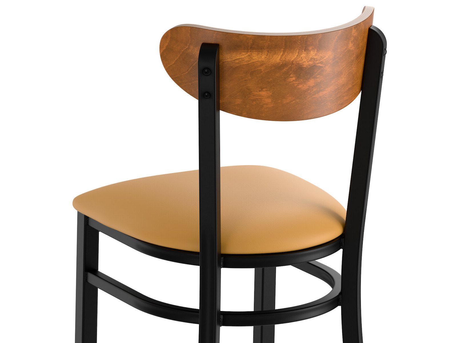 This chair's wooden Boomerang back and padded seat combine with its modern steel frame to instill a unique look in any location. Plus, since this chair's back is contoured for a customer's back, it will provide comfort while maintaining a distinct appearance.