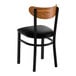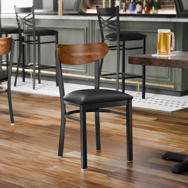 This chair's sturdy steel frame provides unmatched durability in your commercial dining room. It can hold up to 330 lb. of weight thanks to the steel frame and supports under the seat. Additionally, the black finish on this chair ensures longevity through everyday wear and tear, resisting stains, scratches, and smudges. It also features an attractive vintage wood back that's contoured to provide extra support to your customers' upper backs. The 2 1/2" thick black vinyl padded seat brings exceptional comfort and durability while remaining easy to clean. It is made with fire-retardant foam for ultimate safety!