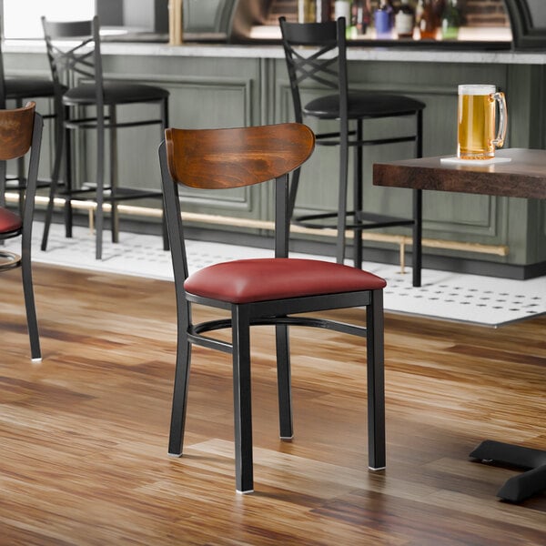 Seat your guests in comfort and style with this Lancaster Table & Seating Boomerang black finish chair with 2 1/2" burgundy vinyl padded seat and vintage wood back. This chair's wooden Boomerang back and padded seat combine with its modern steel frame to instill a unique look in any location. Plus, since this chair's back is contoured for a customer's back, it will provide comfort while maintaining a distinct appearance.